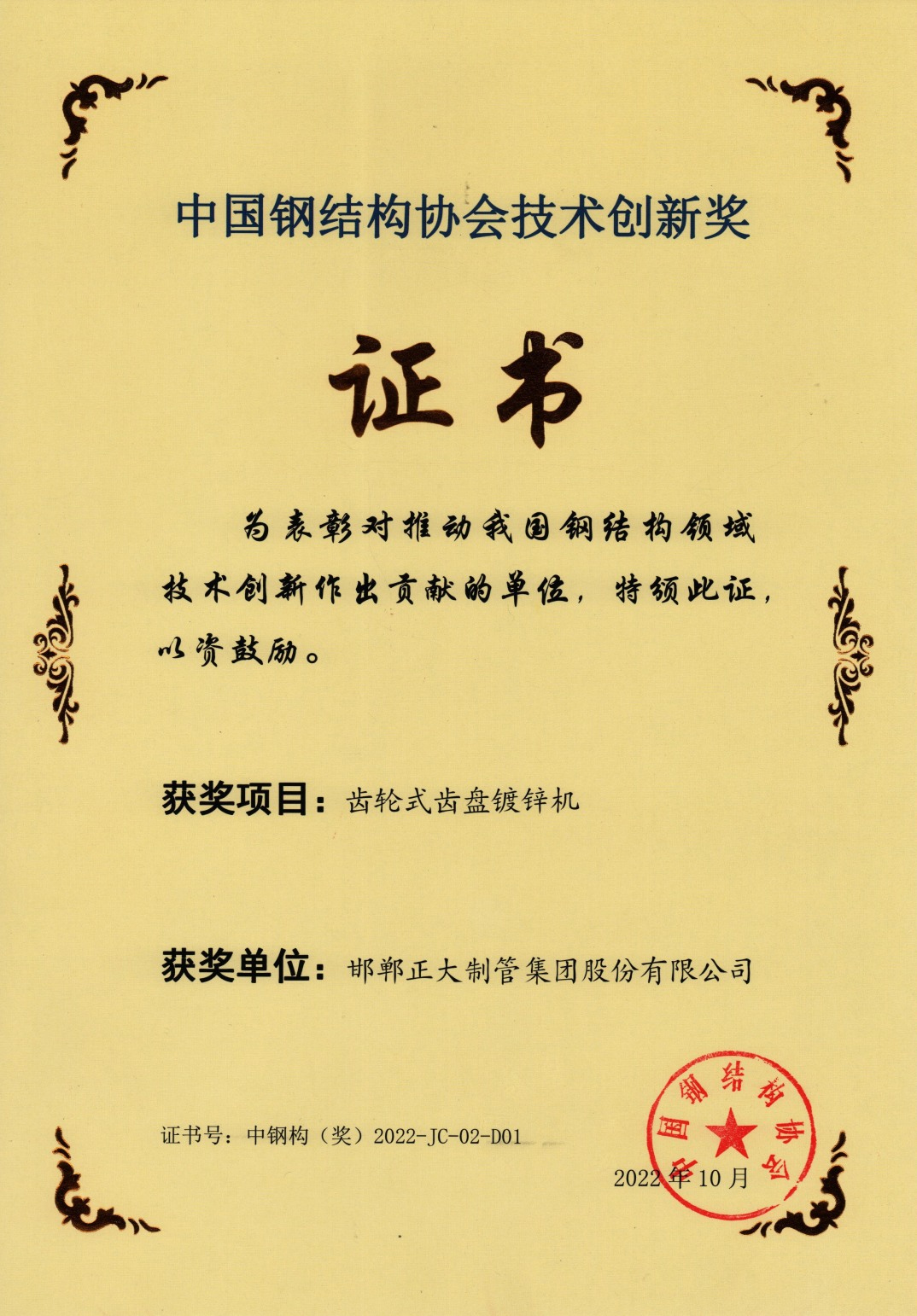正大制管榮獲中國(guó)鋼結(jié)構(gòu)協(xié)會(huì)“技術(shù)創(chuàng)新獎(jiǎng)”